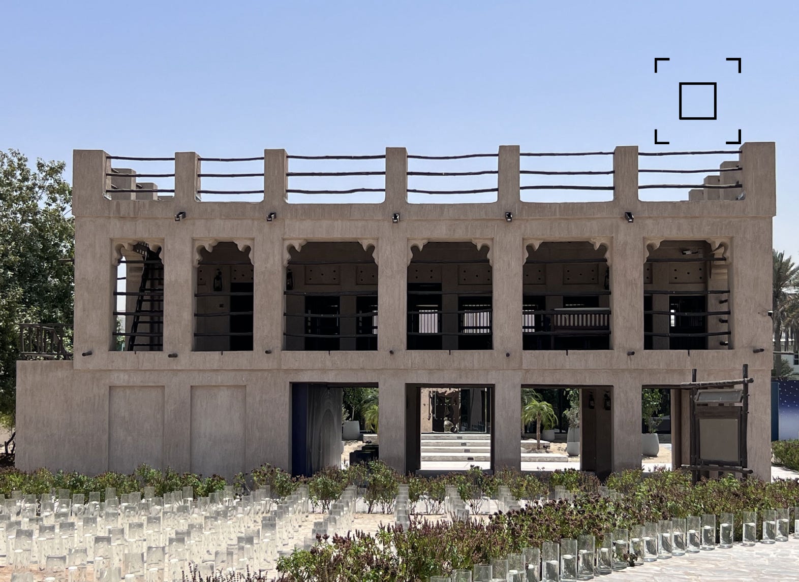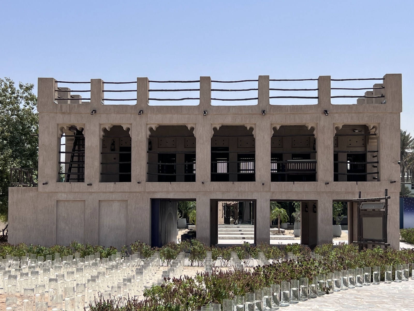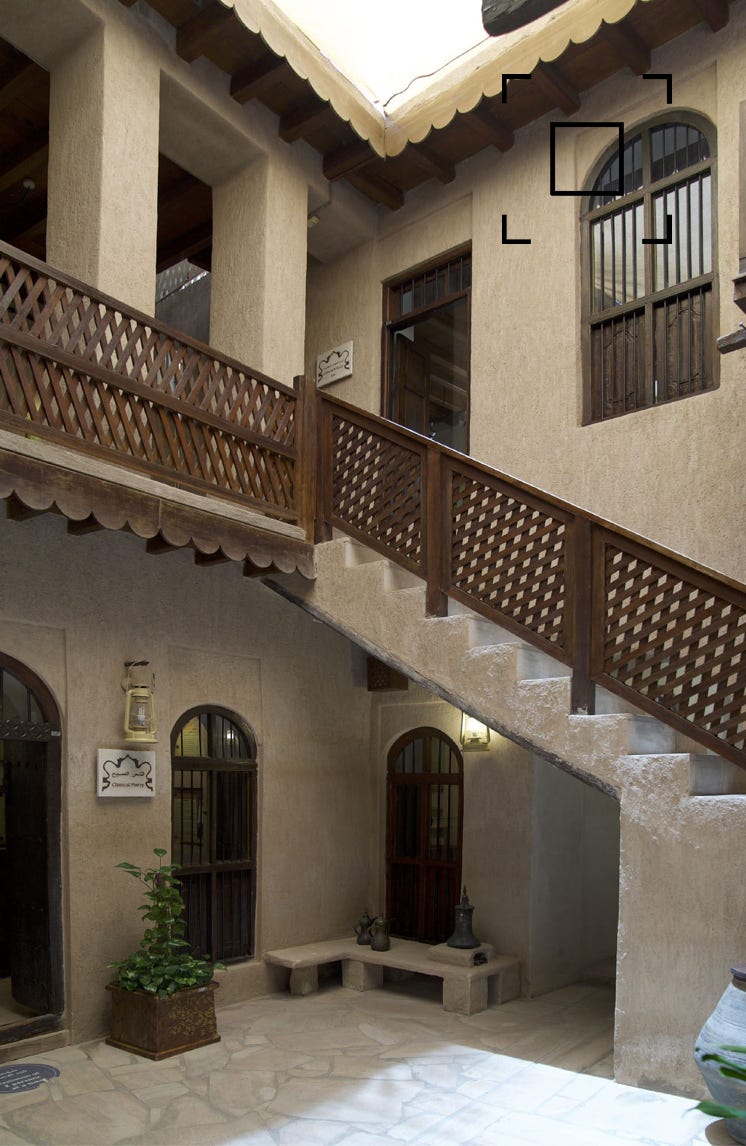 Situated in a palm tree garden in the middle of a residential neighborhood in Dubai, stands the historically important Majlis Ghorfat Umm Al Sheif. Ghorfat in Arabic means room, the “room in the neighbourhood Umm Al Sheif” was the summer majlis of Dubai’s former ruler, the late Sheikh Rashid bin Saeed al Maktoum. Built in 1955, the majlis served as a gathering and thinking space to Sheikh Rashid. Elevated from the ground to capture the light coastal breeze, the majlis was set in traditional taqia cushions along the wall and complemented with modern amenities such as a radio and clock. Traditional artefacts, khoos (from palm leaves) to cover dates offerings to the guests along with Arabic coffee, could typically be found in the majlis at the time.